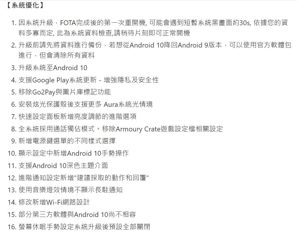 ASUS ROG Phone II 升級至 Android 10 後,除了將在快速設定面板新增亮度調節的選項、修改與新增 Wi-Fi 網路的設計,全系統採用通話獨佔模式,並支援 Google Play 系統更新外;也會移除 Go2Pay 與圖片庫標記功能,使用音樂燈效情境時不顯示長駐通知,螢幕休眠手勢會在系統升級後預設為全部關閉。升級前可將資料進行備份,也能透過官方軟體包降回 Android 9 版本。