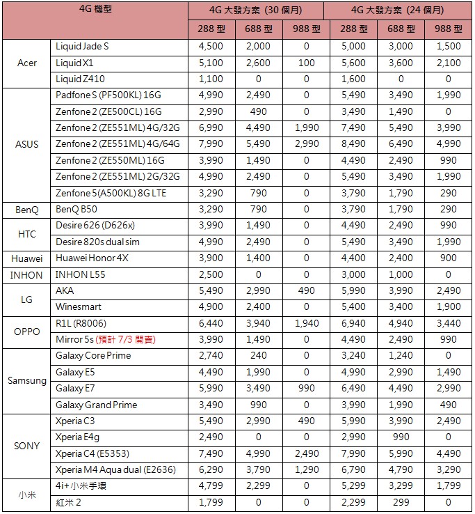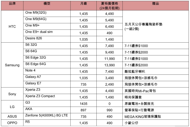 中華電信夏特賣 - 極速方案精采 Hami 包優惠機型: