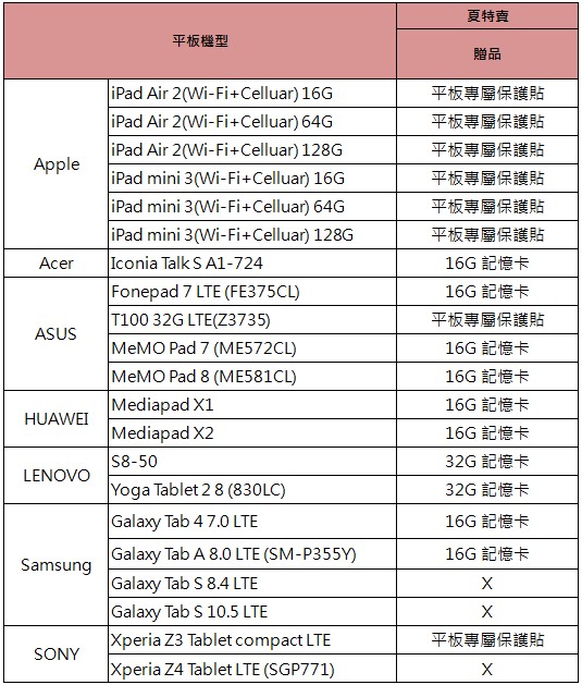 中華電信平板大玩家方案精選機型及夏特賣優惠活動贈品: