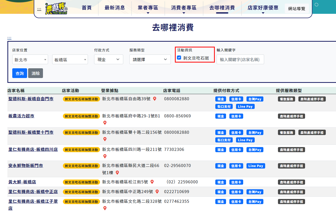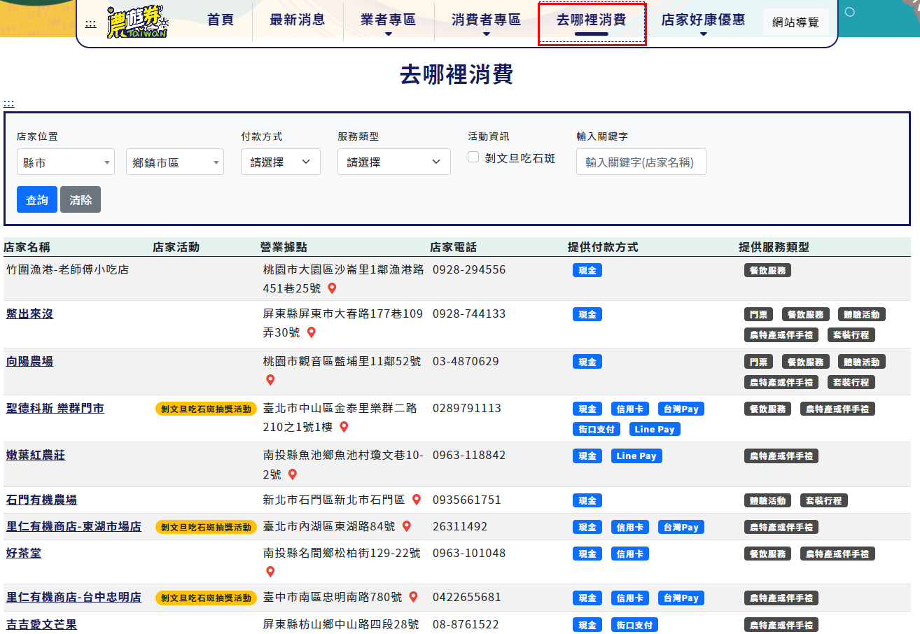 ▲本次「六吃興旺」活動可以前往「農遊券官網」,透過點選網站上方的「去哪裡消費」來查詢「合作店家」。
