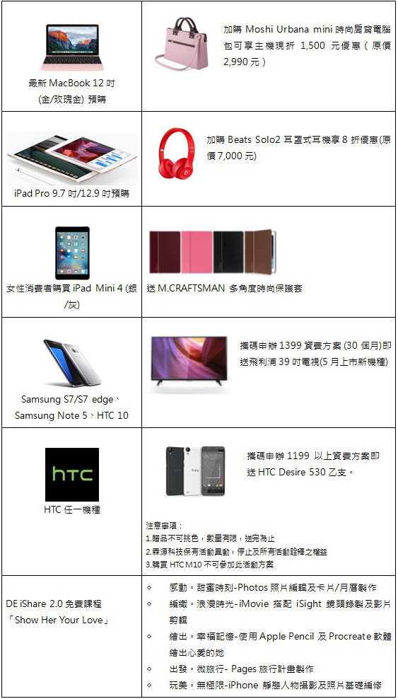 德誼數位今日(4/25)公佈母親節特惠專案。即日起至 5/8 止,凡預購 / 購買 9.7 吋或 12.9 吋 iPad Pro 平板電腦,即可以 8 折優惠加購 Beats Solo 2 耳罩式耳機,全台限量 100 組;凡購買 iPad Mini 4 銀色或太空灰色,買就送 M.CRAFTSMAN 多角度時尚保護套。此外,購買玫瑰金以及金色的新款 MacBook 筆電,再加購 Moshi 粉色肩背電腦包可享 1,500 元現折優惠。針對 5/6 至 5/8 日母親節周末假期間,凡女性攜親友至德誼維修站,兩人即可免費同享 iPhone 手機健檢服務,再享當日保護貼 5 折優惠。