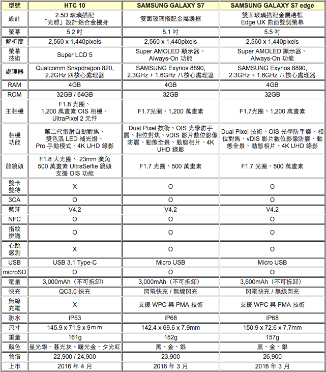【HTC 10 與三星 S7 系列規格比較】