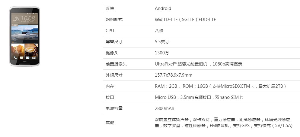 一款名為 Desire 828 dual sim 的新機在 HTC 中國官網現身。HTC Desire 828 dual sim 機身厚度僅 7.9mm,搭載 5.5 吋 1080P 螢幕、聯發科 MT6753 八核心處理器、2GB RAM / 16GB ROM,支援最大 2TB microSD 擴充,電池容量 2,800mAh(搭配另購充電器可使用 5V/1.5A 快充),並配備雙前置立體聲喇叭與 BoomSound with Dolby 音效,以及雙卡雙待功能。HTC Desire 828 dual sim 不僅擁有 1,300 萬畫素主相機,而且還是 Desire 系列首度採用 OIS 光學防手震功能的產品 ,可偵測 0.125 毫秒的機身晃動並進行回饋補正。前鏡頭的部分則是 F2.0 UltraPixel。HTC Desire 828 dual sim 共有騎士白、魅影灰兩種顏色。目前已於中國開放網路預約,售價為 1,599 元人民幣(約台幣 8,186 元),預約就送價值 119 元人民幣的聆悦 MAX 301 入耳式立體聲耳機。