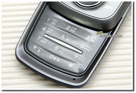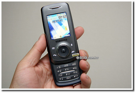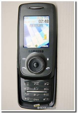 S730i 的身形相當小巧,鐵灰色系的用色,搭配壓克力材質包覆的機身,使手機帶有半透明的反射效果,採用三星引以為傲的半自動滑蓋架構,只要以姆指在五向鍵稍微向外推開,手機的上蓋就會自動滑出,不過因為沒有明顯的推開輔助,必須要多使用幾次並習慣後,才能順利的滑蓋操作。