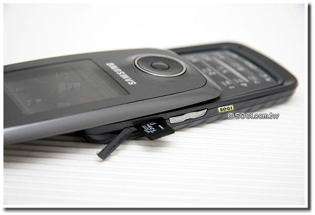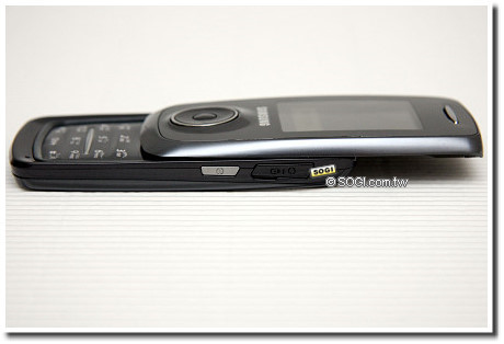 S730i 的機身厚度僅 15.4mm,雖不算超薄,但也不會太厚,由左右兩側的照片即可証明。機身左側分別配置了 microSD 擴充槽及音量按鍵,其中 microSD 記憶卡最高可擴充至 2GB 的容量。手機的右側也相當精簡,只有 SAMSUNG 自家規格的插頭(支援傳輸、耳機與充電)及電源鍵,電源鍵除了開關機外,如果使用者想不推開滑蓋查看手機狀態,也必須先按壓電源鍵喚醒手機(開啟熱感應面板),才能進行後續動作。