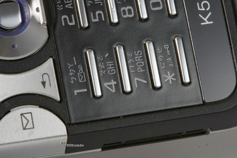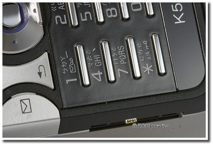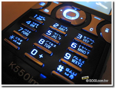 鍵盤區的設計,K550im 因應 i-mode 需求,將 K500im 右邊的半圓形快捷鍵由捷徑選擇鍵,改為 i-mode 快捷鍵。整體而言,按壓觸感不錯頗有彈力。