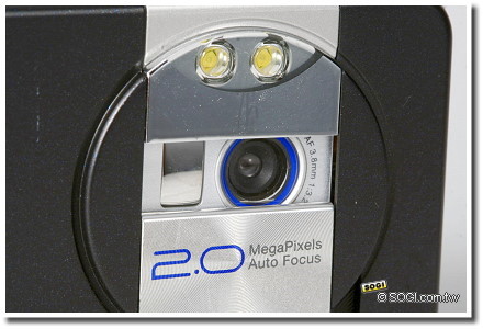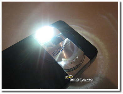 鏡頭上方有兩顆 LED 閃光燈,亮度驚人與以往 Sony Ericsson 具備閃光燈的照相手機並無差異。而且,沒有被鏡頭蓋遮住的閃光燈,還可獨立開啟當作手電筒使用,另提供 SOS 求救閃燈模式,夜歸很實用。