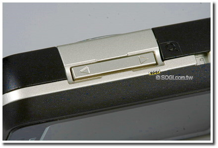 K550im 的機身兩側讓人有點眼花撩亂,仔細看右側靠下方的是,圓形的拍照快捷鍵,按壓時感覺柔軟,不需很費力就能輕鬆按快門;上方為調整音量及拍攝時 zoon in、zoon out 的上下選鍵。