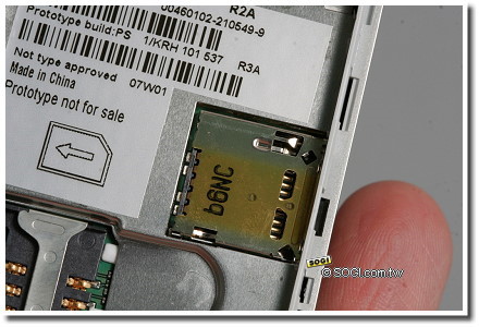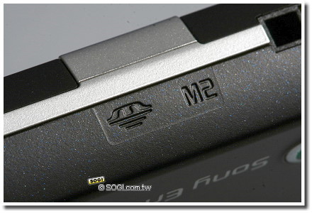 左邊由於沒有背蓋鎖,看起來清爽一些。靠近下方的是 USB 傳輸充電與耳機兩用埠,中央有則"標示" M2 記憶卡位置,事實上 M2 記憶卡是在電池下方,得掀蓋後才能置入。
