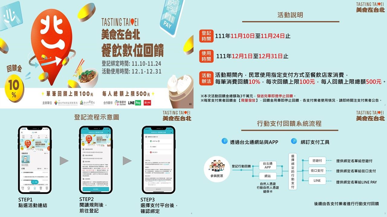 台北市商業處宣布攜手 LINE Pay、街口支付、悠遊付等業者,預告在 12/1~12/31 推出「美食在台北」活動,期間只要於合作店家完成消費,即享每筆 10% 回饋(最高 100 元回饋金),最多可累積回饋 500 元(活動總共限量 3,000 萬元回饋金)。需要注意的是活動採用登記制,各位必須在 11/24 前至台北通 APP「餐飲數位回饋」專區登記方可使用。