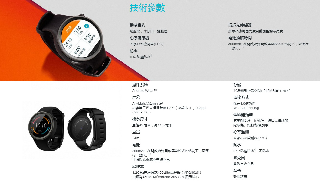 ▲Moto 360 Sport 針對運動族群設計,採用矽膠錶帶設計,重量 54g,配備 35mm 的圓形 360 X 325pixels AnyLight 螢幕,共有峭壁黑、冰原白、躍動橙 3 種顏色款式。