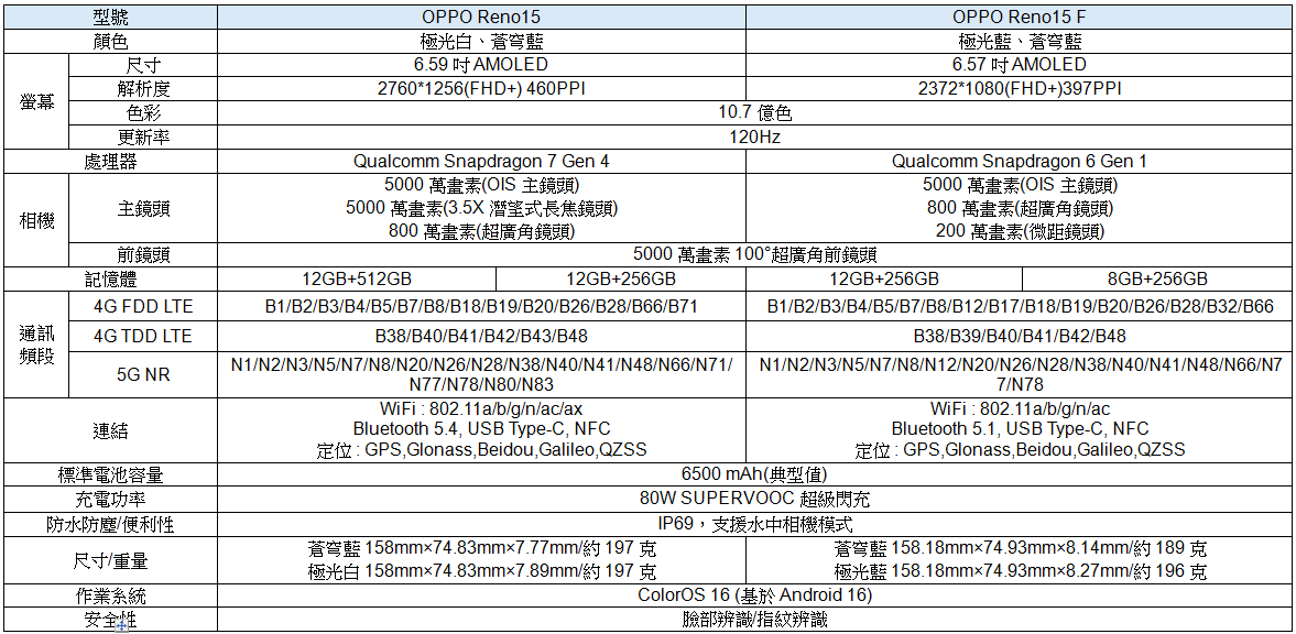 ▲OPPO Reno15 與 Reno15 F 規格比較。