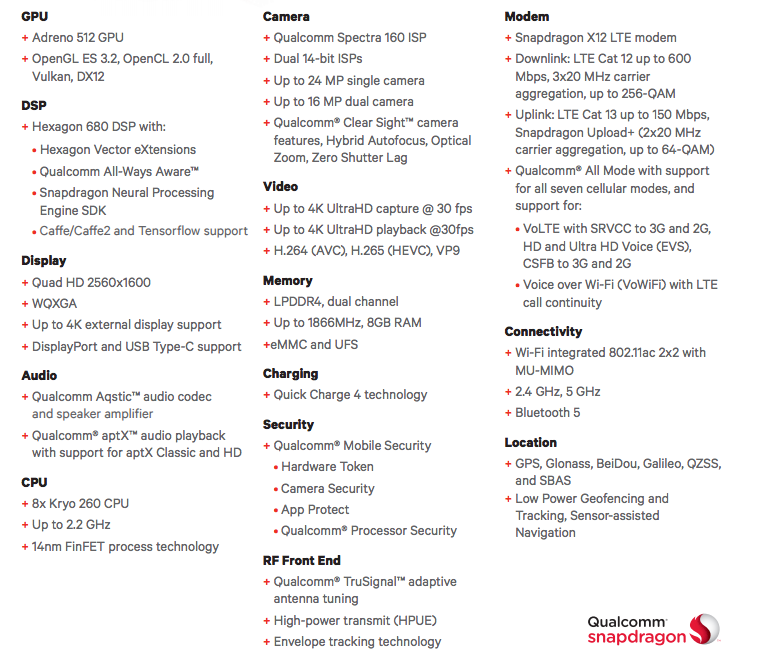 Qualcomm Snapdragon 660 承襲 Snapdragon 653,並加入效能提升 20% 的高通自主架構 Kryo 260 CPU,以及效能提升 30% 的 Adreno 512 GPU,提供更佳的電競與多媒體體驗。Snapdragon 630 則是承襲 Snapdragon 625 的特色,其搭載的 Adreno 508 GPU 效能較前一代提升 30%,CPU 效能也較前一代提升 10%。兩款平台採用 14 奈米 FinFET 製程,皆是設計用以支援更佳卓越的電池續航力,可提供 4K 影片拍攝與播放功能、高達 8GB RAM,並支援 Vulkan API 應用程式介面。Snapdragon 660 亦能支援高達 QHD(2K)的螢幕解析度,而 Snapdragon 630 則支援 FHD / QXGA(1080p)解析度。