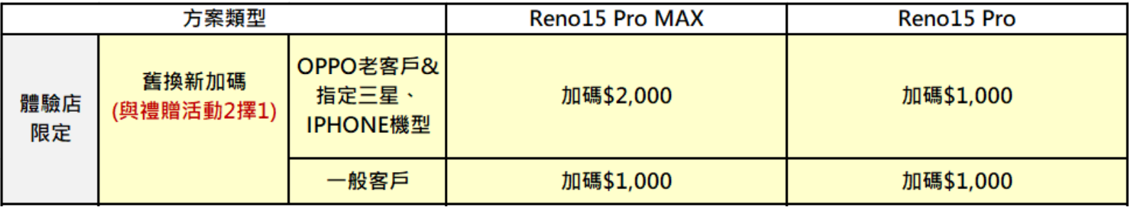活動期間內,於全台 OPPO 體驗店持指定舊機機型可享加碼優惠,購買 Reno15 Pro 舊換新最高再折 1,000 元,Reno15 Pro Max 舊換新最高可折 2,000 元;購買 Find X9 舊換新最高再折 3,000 元,Find X9 Pro 舊換新最高可折 5,000 元。需要注意的是,回收認列機型依 OPPO 體驗店舊換新活動網站公告為主,實際回收價格則依現場舊換新 APP 檢測為基準。