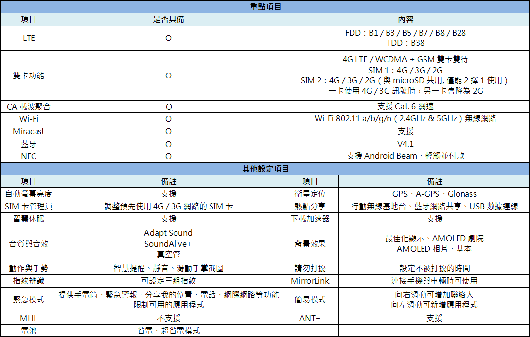 點評:SAMSUNG GALAXY A5 (2016) 支援 4G 雙卡雙待,具備台灣 B3 / B8 / B28 等 4G LTE 頻段、Cat. 6 網速,有大容量需求的用戶還可透過 microSD 記憶卡擴充空間 。