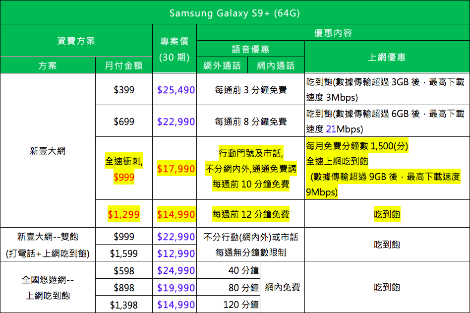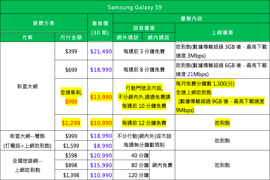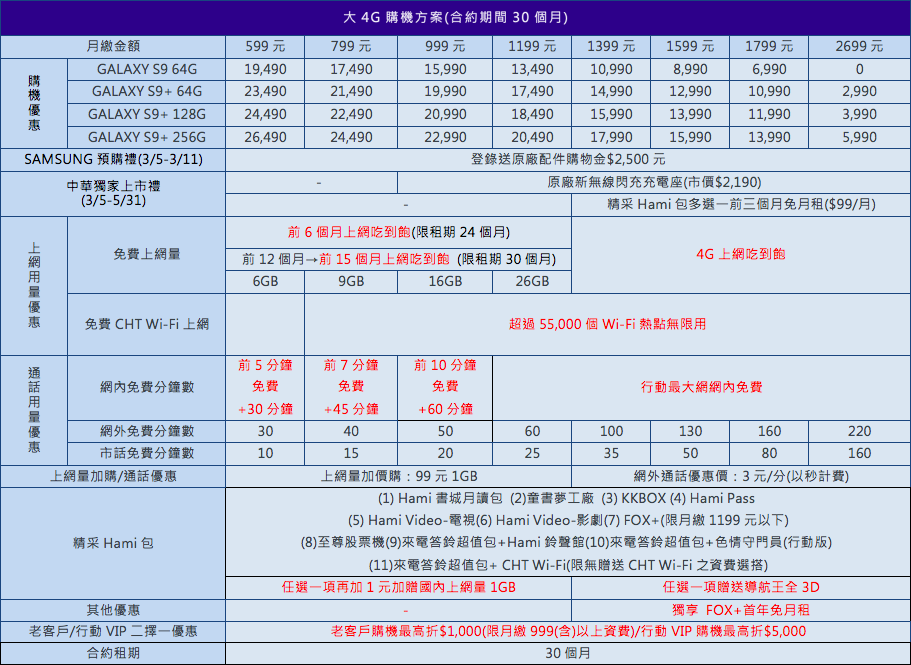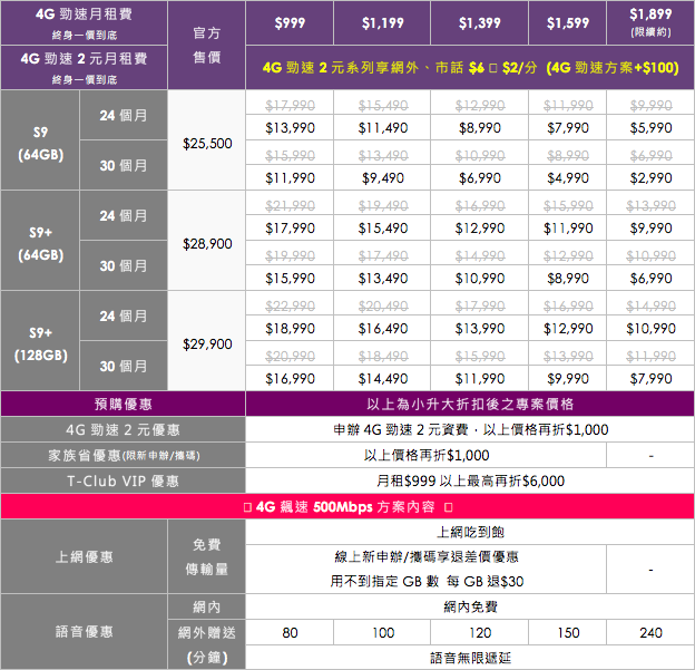 ![SAMSUNG S9與S9+五大電信資費方案整理 SAMSUNG S9與S9+五大電信資費方案整理]()