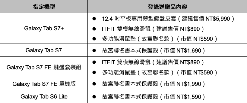 此外,三星亦與國立故宮博物院聯名推出平板專屬周邊配件,凡於 9/1~10/31 止,購買 SAMSUNG Galaxy Tab S7 旗艦系列及 Galaxy Tab S6 Lite,並於活動網站完成登錄,即可獲得故宮聯名書本式保護殼(市值 1,590 元起)或故宮聯名多功能滑鼠墊(市值 590 元)等專屬周邊配件。