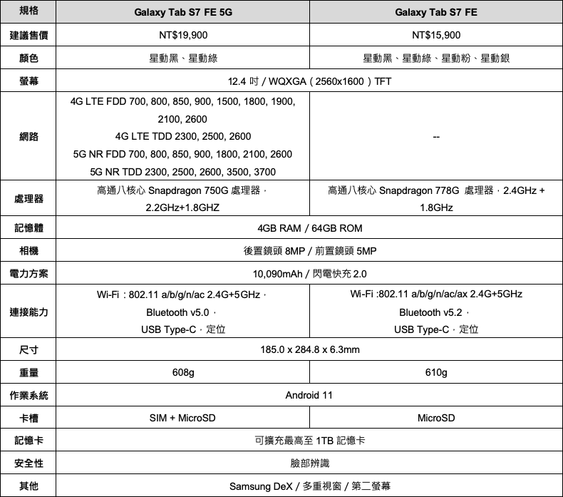 ▲SAMSUNG Galaxy Tab S7 FE 系列重點規格。