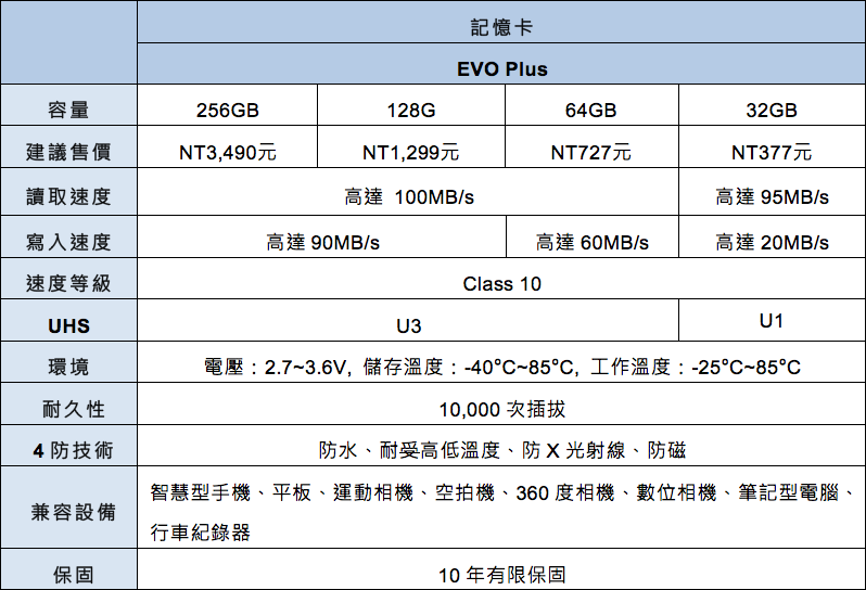 ▲SAMSUNG EVO Plus 記憶卡產品規格。