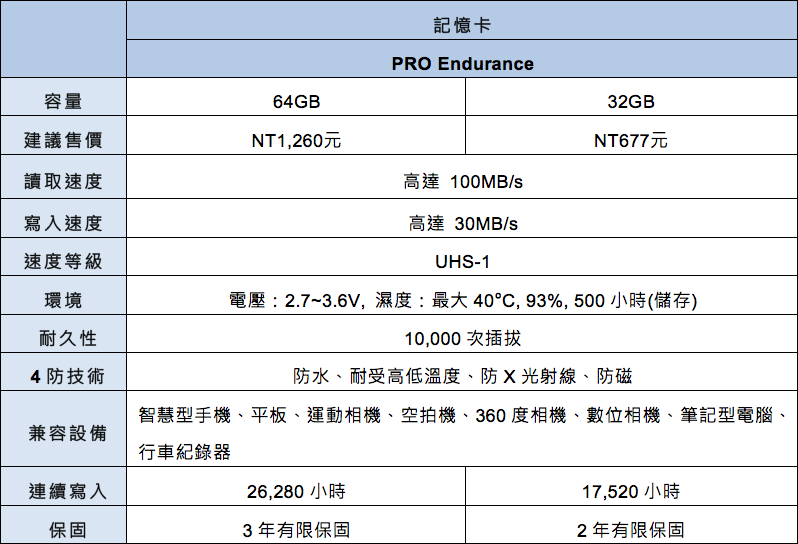 ▲SAMSUNG PRO Endurance 記憶卡產品規格。