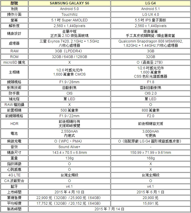 【SAMSUNG GALAXY S6、LG G4 規格比較】