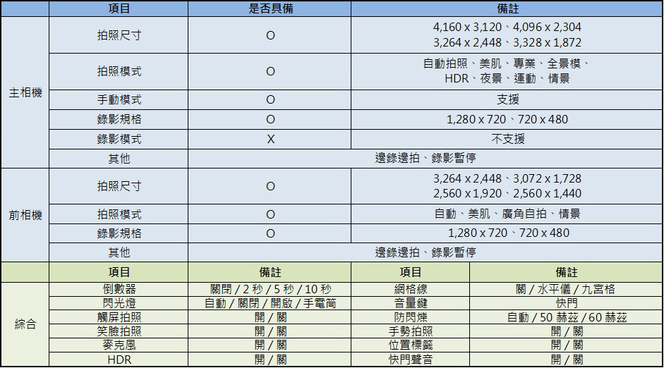 | 前鏡頭 | 800 萬、F2.2 光圈、LED 補光燈 |