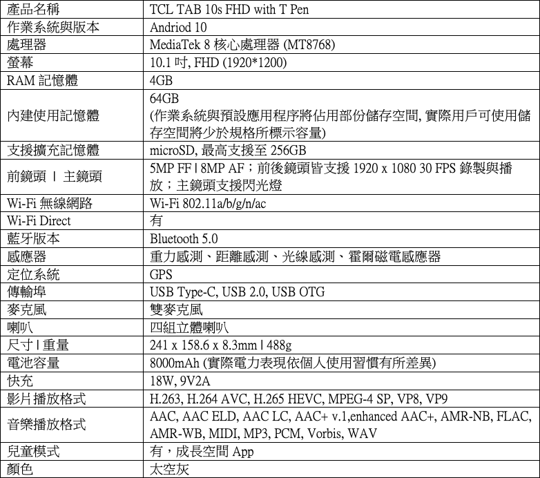 TCL TAB 10s FHD 搭載聯發科 MT8768 八核心處理器、4GB RAM 與 64GB 儲存空間,內建 500 萬畫素前鏡頭、雙麥克風和四喇叭揚聲器系統,並且擁有 8,000mAh 超大電量,充足電量可以提供至少 8 小時影片播放或 5 小時線上遊戲,還能透過 18W 快速充電,讓電量迅速回到 100%,適合孩童遊戲、學習,或是大人追劇、視訊及線上課程使用。