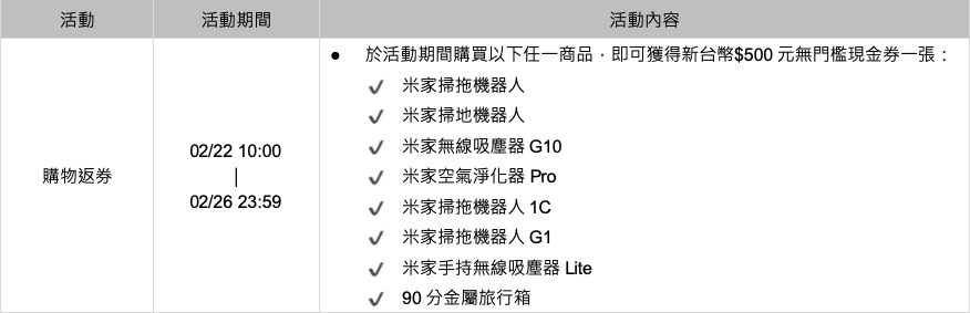 另外,購買米家掃拖機器人、米家掃地機器人、米家無線吸塵器 G10、米家空氣淨化器 Pro、米家掃拖機器人 1C、米家掃拖機器人 G1、米家手持無線吸塵器 Lite、90 分金屬旅行箱等任一商品,還可獲得 500 元現金券乙張。