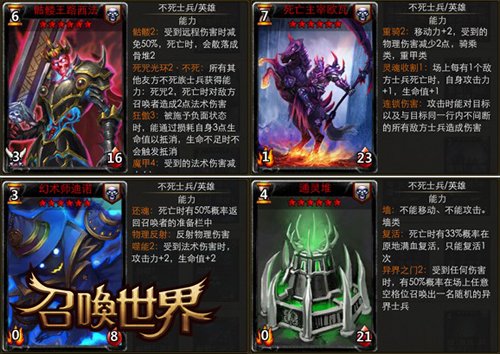 新版本中,由“骷髏王路西法”,“死亡主宰歐瓦”,“幻術師迪諾”,“通靈堆”四張亡靈英雄領導的骷髏軍團和死靈騎士軍團強勢加入不死族陣容。新兵種不僅繼承了不死種族強大的重生能力,更提升了戰場移動力和對敵方召喚師的直接傷害能力。絕對值得加入手牌,強化卡組。