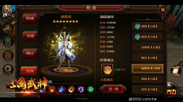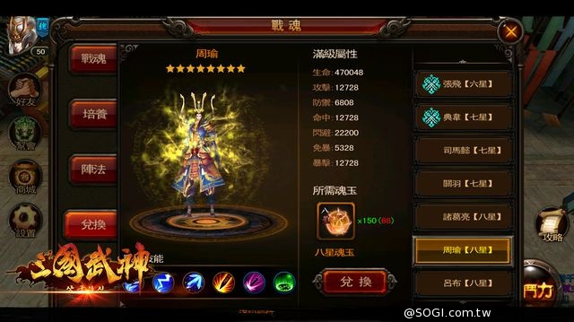 繼之前公佈的紫色戰魂武將,這次改版中,官方再度搶先釋出三個八星橙色戰魂的資訊,分別是超級戰神-呂布、運籌帷幄-諸葛亮與三國型男-周瑜。三人的各項基礎能力值除了跟紫色戰魂相比又躍進一步外,都還有各自優勢之處,例如以武力聞名的呂布在攻擊上有顯著的提升;諸葛亮則是以爆擊較為強勢;而周瑜則是閃避率超高,相當刁鑽。玩家們不妨以首發這三位橙色戰魂為目標,繼續在三國戰場上前進吧!韓國營運代表李太皓透露,目前研發團隊也正積極規劃全新的紫色與橙色戰魂,更多熟悉的三國英雄將陸續登場,請玩家拭目以待。