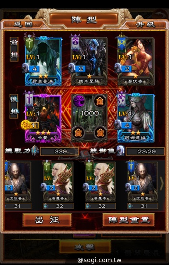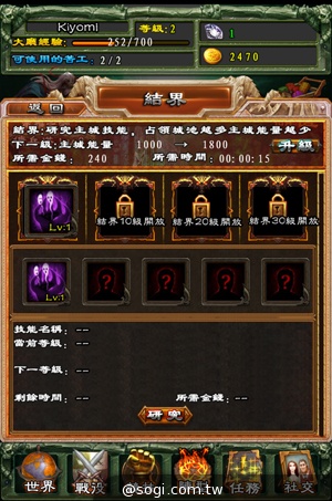「結界升級」可以增加主城能量。當戰役中,主城一直被敵人打死的時候,除了強化英雄、重佈陣形之外,還要確認一下「結果」的等級是否有提升。