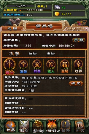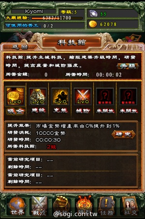 傭兵塔、科技館必須大廳達到 5 等級才可升級。科技塔的升級,可以提升主城的科技,並且進行城防、建設、吸金…等等的研究活動。傭兵塔則是英雄的修練之地,用來提升各個職業的攻防。