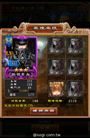遊戲中的卡牌英雄依品質由低至高分為白、藍、紫、橙、金色。一個英雄的完整屬性養成中,升級占 40%、升星占 40%,還有玩家主城中的「科技系統」占 20%。玩家可選擇至多 6 個英雄,讓主英雄以吞噬方式來升級。英雄的等級取決了英雄的「領導力」、「等級上限」,還有血量、攻防力等等。