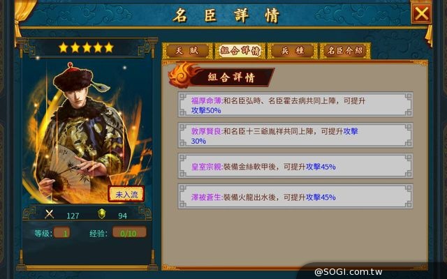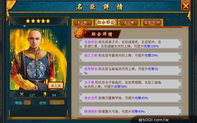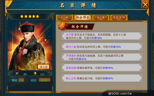 - 與太子爺胤礽,索爾圖,十三爺胤祥同時上陣:防 +58%