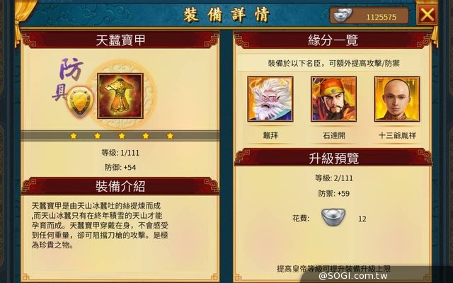 在遊戲中,除了擁有知名武將的協助,皇子的加持,與後宮美女們的輔佐,當然最不能少的還是罕見的稀有神兵利器!全新的絕品武器防具限時推出,絕對讓各位皇上愛不釋手!