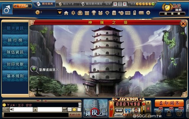 玩家可點擊遊戲主畫面進入神摸之塔,遊戲內以競技麻將血戰賽任務為完成條件之闖關機制,任務難度會隨登塔層級往上提升,吃碰槓聽胡自摸等關卡皆有可能發生~《競技麻將》遊戲團隊將麻將遊戲再進化,除了保留最原汁原味的經典打牌風格,同時也搭配與兇獸 PK 的加碼樂趣,一起來顛覆你的麻將世界,《競技麻將》封印兇獸來襲,等各路牌手來挑戰喔!