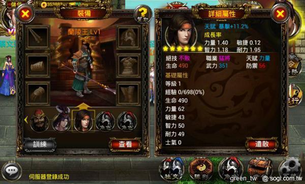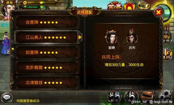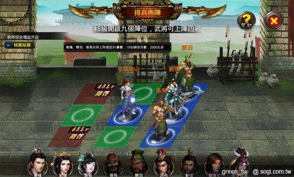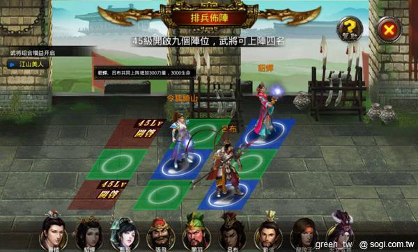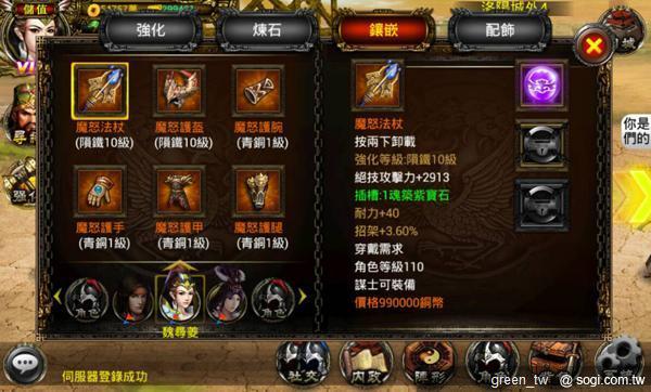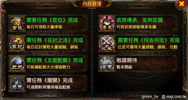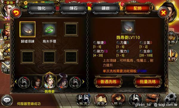 另外,玩家可強化角色及各武將的裝備,改版中玩家將可對配飾進行「洗鍊」,提高武將在敏捷、力量、士氣、耐力、智力及生命方面的屬性。