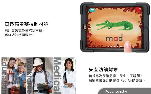 首款專為學齡兒童、學生、工程師、醫療單位,或其他可能對 iPad Air 造成傷害的環境而進行使用設計。擁有 IPX4 防潑水認證,飲料打翻在螢幕正面也不用擔心;美國軍事防摔等級 MIL-STD-810 認證,可承受高度 122 公分摔落;特殊防滑材質與輕量化設計,讓學童小手好拿好用!