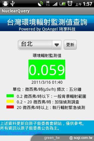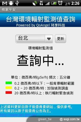 有鑑於民眾對環境輻射含量的關心,琦享科技(QoAngel)特別以原子能委員會網站即時更新的資料為主,整合行動、定位、網路等技術,開發一個可以讓使用者透過智慧型手機隨時、隨地查詢附近輻射監測站觀測值的「核家平安」行動軟體(for Android),免費提供民眾下載,讓民眾多一個查詢環境輻射含量的管道。該軟體主要功能如下: