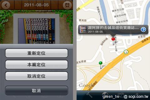 另外一項特色為「手機定位」功能,記下該則記事時,可點選 Map 開啟地圖地位功能,下次想帶家人朋友去同一定餐廳,也不用擔心忘了詳細地址。同時,每一個定位點都會儲存在紀錄中,讓使用者可以一目暸然曾經出沒的地點。除了記錄文字、圖片、每個事件的發生時間及發生地點,還可透過郵件、簡訊或以 Facebook 將圖文分享給朋友。
