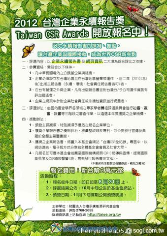 今年「2012台灣企業永續報告獎」主要獎項除以往製造業、非製造業組別外,另增設非營利組織組,歡迎政府單位、科學工業園區、工業區、產業公協會、NGOs等單位踴躍報名參選。此外,今年首度將「企業CSR網站」納入永續報告書之綜合評比項目中,以提升企業網頁中永續資訊揭露水準。參與台灣企業永續報告獎之獲獎企業CSR報告書將彙整收錄於「台灣企業永續報告獎年度評鑑專刊」,並公開發行宣傳和典藏於全國主要圖書館,以及置入本基金會網站「台灣CSR全紀錄」專區中。凡參賽之企業除皆可獲得評選委員會針對個別企業報告書內容所提供之改善建議報告乙份,作為企業精進報告書內容之參考依據外,亦將獲基金會推薦至全球報告倡議組織(GRI)網頁報導與宣傳,提高國際能見度及CSR績效聲譽,在世界各國重視產業綠色與永續供應鏈的今日,將有利於國際企業做為評選供應商之資訊參考。