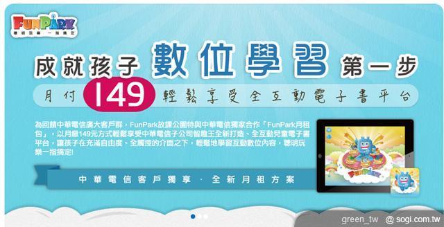 智趣王數位科技與中華電信獨家合作,以月付 149 元超優惠價回饋中華電信客戶。「FunPark 月租包」推薦 25 個單元,內容包含床邊故事、數學概念、認識注音、英文字母與單字及英語視聽教學等,並於每月自動更新單元,讓使用者輕鬆享有數位學習內容。