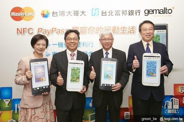 這項提供消費者多元豐富行動支付的新服務,台灣大哥大與台北富邦銀行還結合萬事達卡國際組織與金雅拓公司共同聯手合作,推出「NFC PayPass 手機服務」。未來消費者只要使用 NFC 智慧型手機,搭配台灣大哥大 SWP-SIM 卡,即可將所有卡片服務結合於手機裡,發揮 NFC PayPass 手機全方位功能。
