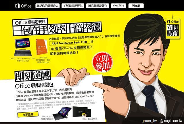 自 11 月 1 日起,前 1000 名消費者於活動期間內購買「Office 365 家用進階版」或 Office 2013、並上網登錄驗證, 即可獲得職場利器「Office 職場逆襲包」,加碼再抽 Sony VAIO Duo 13 (市價 NT$59,800)!詳情請上官方網站:http://www.office-4-work.com