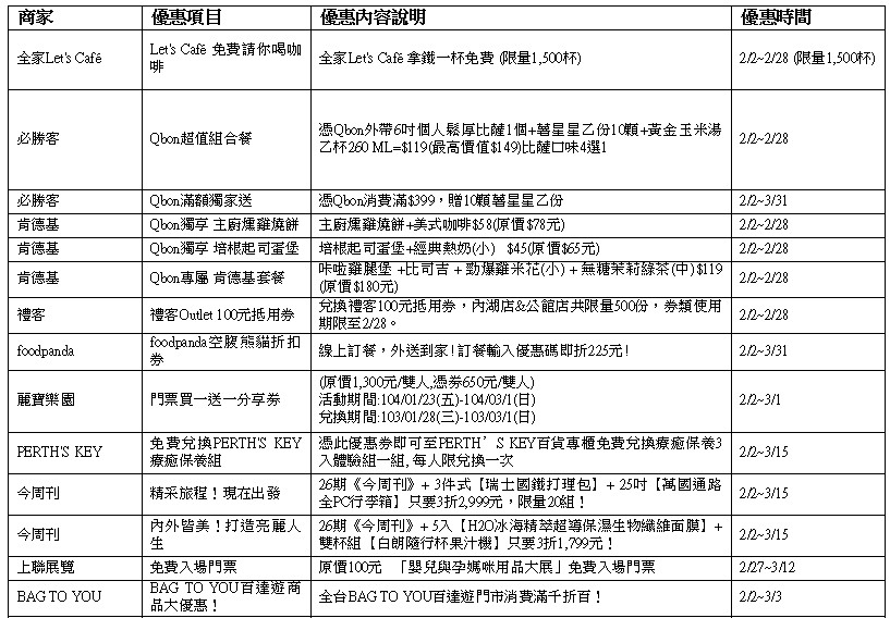 此次優惠內容包含:全家 Let's Café 限量送、肯德基 Qbon 專屬套餐優惠、必勝客超值組合餐、今週刊訂購優惠、PERTH'S KEY 免費 3 入體驗組... 等,整個 2 月,55688 讓你優惠一路發!