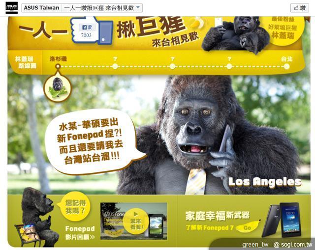 還記得擁有維持家庭幸福秘密武器 ASUS Fonepad 的巨猩林蓋瑞嗎?想要一睹蓋瑞的風采嗎?趕緊呼朋引伴幫忙集氣,巨猩林蓋瑞就有機會來台灣!還可以與蓋瑞合照,體驗最新的 ASUS Fonepad 7 手機平板!
