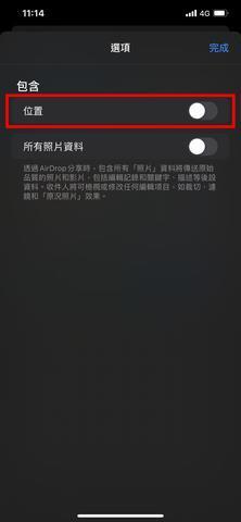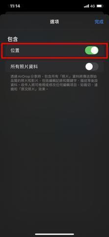 進入選項後就能看到「 位置」選項,將該選項「 關閉 」後點選「 完成 」,這張照片在分享時就不會顯示任何位置資訊囉!
