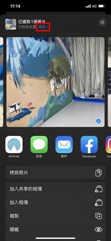 首先在相簿裡選擇要分享的照片,點選左下方的「 分享鍵 」,在分享選單最上面會看到藍底字的「 選項 」