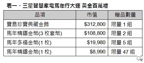 為預祝 2014 馬年好運到,三星智慧全系列家電包括電視 、家庭劇院、冰箱、洗衣機等產品,將送出黃金百萬禮,給消費者討個好采頭!自 12 月 27 日起至 2014 年 2 月 14 日止,凡於活動期間購買三星全系列家電指定機種 (註二) 滿萬元,即可獲得抽 justgold 鎮金店金飾機會乙次。眾多黃金好禮總價值破百萬,包括以二十款台灣稀有動物造型拼接而成的「寶島珍寶」限量典藏金飾、象徵馬到成功的馬年精鑄套幣等,買得越多,獲獎機率越大。三星家電不僅讓使用者新年共享智慧生活歡樂加倍,也為台灣消費者帶來一整年的好福氣!
