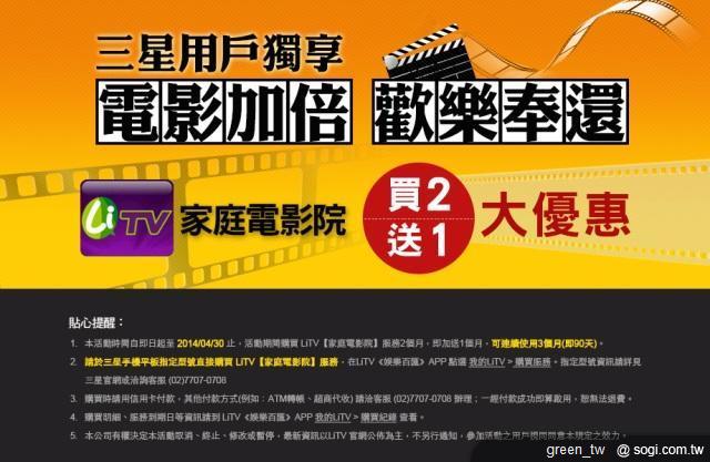 LiTV 回應三星與使用者的支持,針對已體驗三個月免費電影服務卻還想再看的使用者,祭出買 2 送 1 的優惠方案,讓使用者可以繼續方便的享受優質電影。